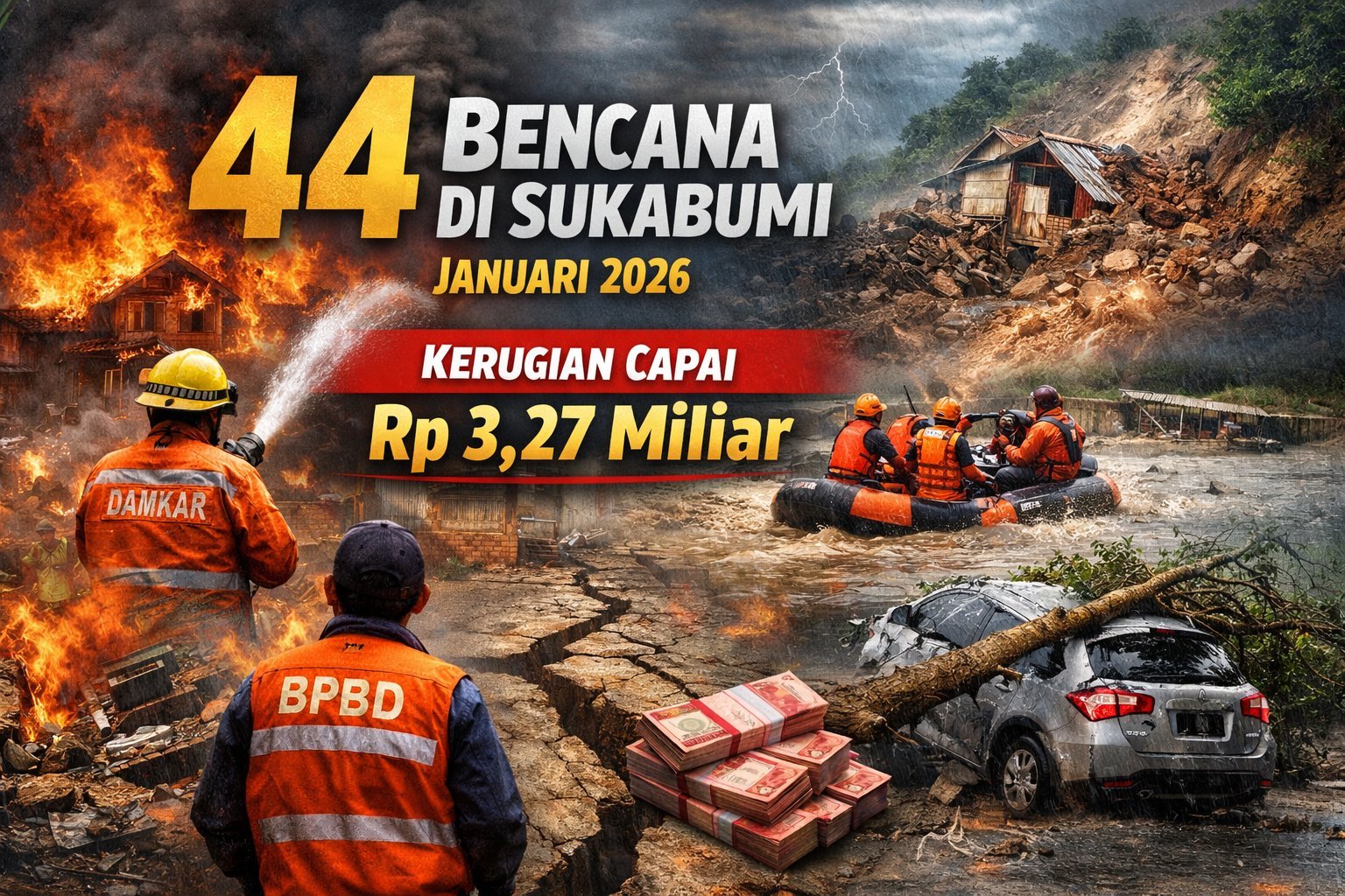 INILAHSUKABUMI.COM – Badan Penanggulangan Bencana Daerah (BPBD) Kota Sukabumi mencatat sebanyak 44 kejadian bencana terjadi sepanjang Januari 2026 dengan total kerugian ditaksir mencapai Rp3,27 miliar. Seluruh peristiwa tersebut tersebar di tujuh kecamatan dan berdampak langsung terhadap puluhan warga.