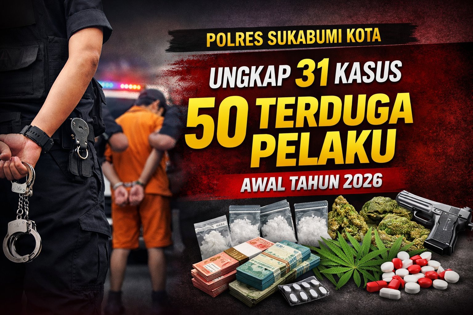 INILAHSUKABUMI.COM – Angka kejahatan di Kota Sukabumi masih terbilang tinggi. Dalam satu bulan saja, Polres Sukabumi Kota mengungkap total 31 kasus kriminal dan narkoba dengan 50 terduga pelaku selama periode 1 Januari hingga 10 Februari 2026. Pengungkapan puluhan kasus tersebut menjadi bagian dari upaya menjaga keamanan dan ketertiban masyarakat (Kamtibmas) di wilayah hukum Kota dan Kabupaten Sukabumi.