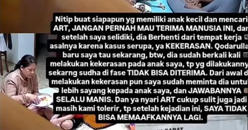 “Nitip buat siapapun yang memiliki anak kecil dan mencari ART, jangan pernah mau terima manusia ini, dan setelah saya selidiki, dia berhenti dari tempat kerja asalnya karena kasus serupa, ya kekerasan, qadarullah saya baru tahu sekarang,” pungkasnya. (*)