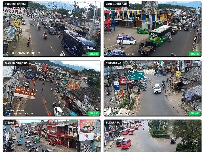 Kondisi serupa terlihat di Jalan Raya Cibadak yang dipadati mobil pribadi dan bus antar kota, sementara simpang Ratu dan Karangtengah juga mengalami kepadatan akibat pertemuan arus kendaraan dari berbagai arah.