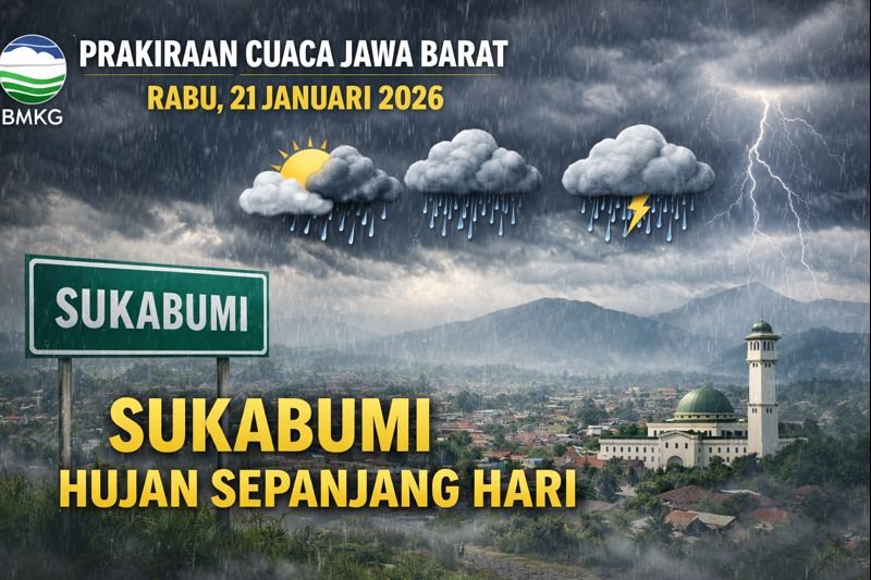 INILAHSUKABUMI.COM – Badan Meteorologi, Klimatologi, dan Geofisika (BMKG) memprakirakan sebagian besar wilayah Jawa Barat berpotensi mengalami hujan pada Rabu, 21 Januari 2026. Hujan diperkirakan terjadi sejak pagi hingga dini hari dengan intensitas ringan hingga sedang di sejumlah daerah.