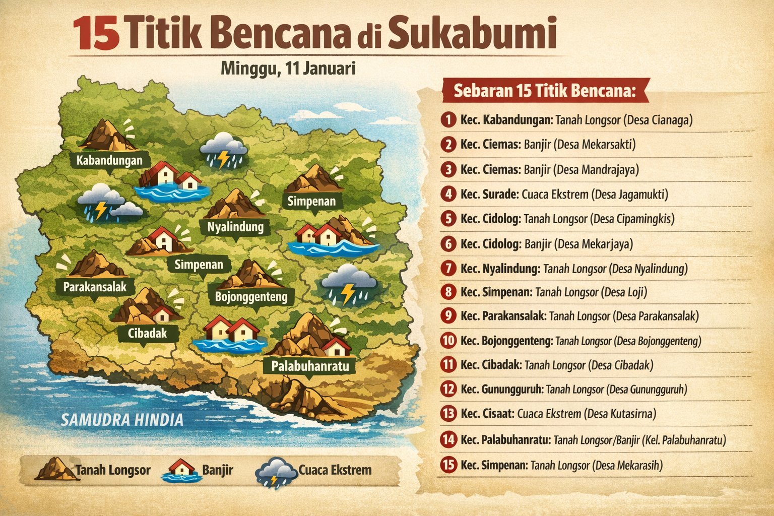 Manajer Pusat Pengendalian Operasi (Pusdalops) BPBD Kabupaten Sukabumi, Daeng Sutisna, mengatakan seluruh kejadian telah dilaporkan oleh petugas di lapangan. “Berdasarkan rekapitulasi laporan harian, total terdapat 15 kejadian bencana yang tersebar di sejumlah kecamatan di Kabupaten Sukabumi,” ujarnya dalam keterangan yang diterima, Senin, 12 Januari 2026.
