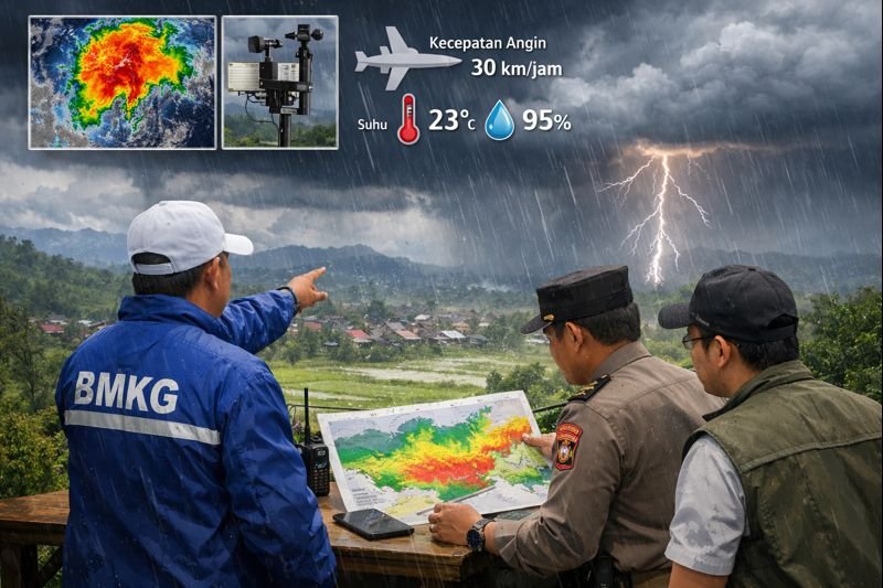 Petugas BMKG memantau perkembangan cuaca ekstrem di wilayah Sukabumi, Jawa Barat, seiring peringatan potensi hujan lebat disertai petir dan angin kencang pada Kamis (22/1/2026). Sumber: Ilustrasi AI / INILAHSUKABUMI.COM.