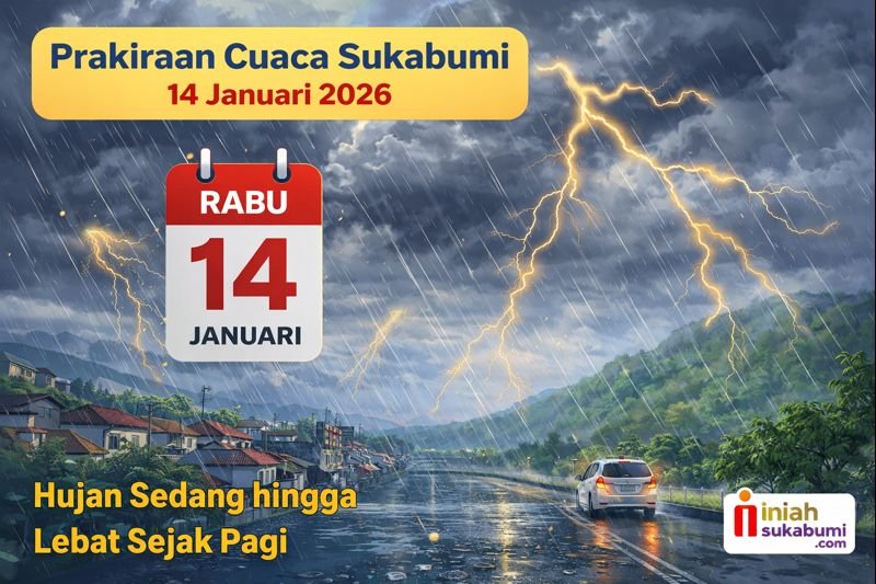 INILAHSUKABUMI.COM – Badan Meteorologi, Klimatologi, dan Geofisika (BMKG) Jawa Barat merilis prakiraan cuaca untuk wilayah Kabupaten dan Kota Sukabumi, Rabu (14/01/2026). Berdasarkan data BMKG, kondisi cuaca di Sukabumi diperkirakan didominasi hujan sejak pagi hari hingga siang, kemudian berawan tebal pada sore hari.