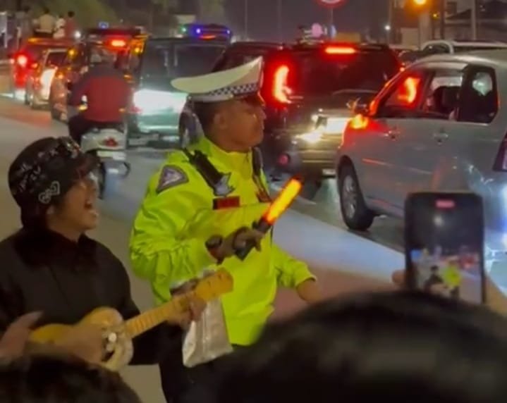 Di tengah kepadatan tersebut, seorang anggota polisi lalu lintas mengambil langkah tak biasa. Aiptu Didik Darmadi, personel Satlantas Polres Sukabumi, mendekat dan bergabung bersama para pengamen. Ia berjoget dan bernyanyi, mencairkan suasana yang kaku akibat antrean panjang.