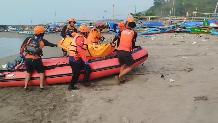 Korban ditemukan pada Selasa (23/9) pukul 06.43 WIB dalam kondisi meninggal dunia, terapung telungkup di perairan Pantai Cimaja, sekitar tiga mil laut dari lokasi awal kejadian.