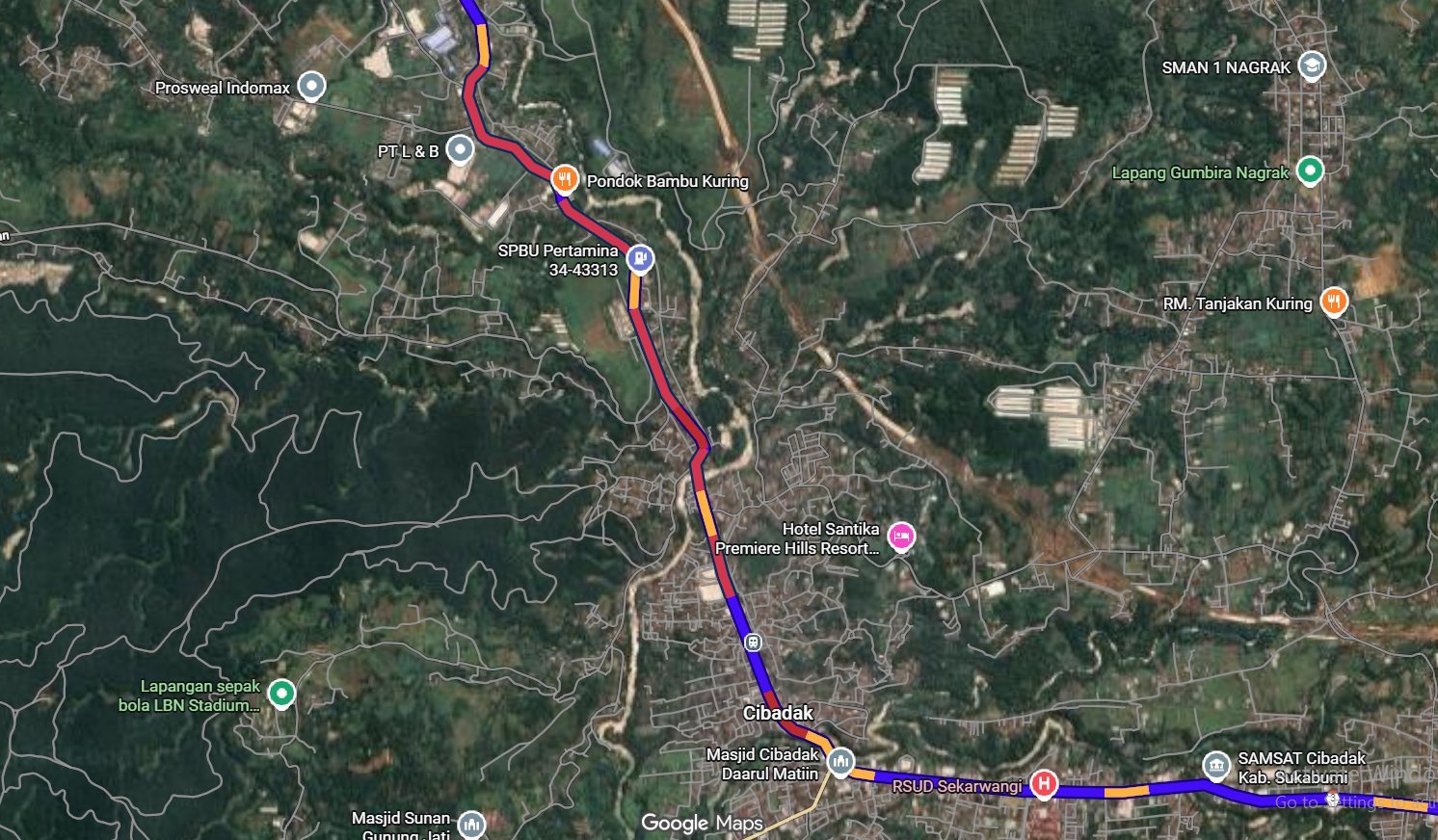 Peta digital menunjukkan kepadatan lalu lintas parah di jalur Cibadak–Parungkuda, Kabupaten Sukabumi, akibat truk mogok di ruas utama yang menyebabkan antrean panjang dan perlambatan arus kendaraan, Kamis (22/1/2026). Sumber: Google Maps.