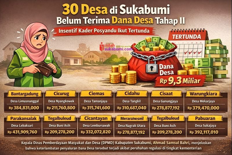 Infografik keterlambatan penyaluran Dana Desa tahap II di Kabupaten Sukabumi yang berdampak pada 30 desa, dengan total anggaran tertahan mencapai Rp9,3 miliar. Foto: Ilustrasi by ChatFGPT/INILAHSUKABUMI.COM