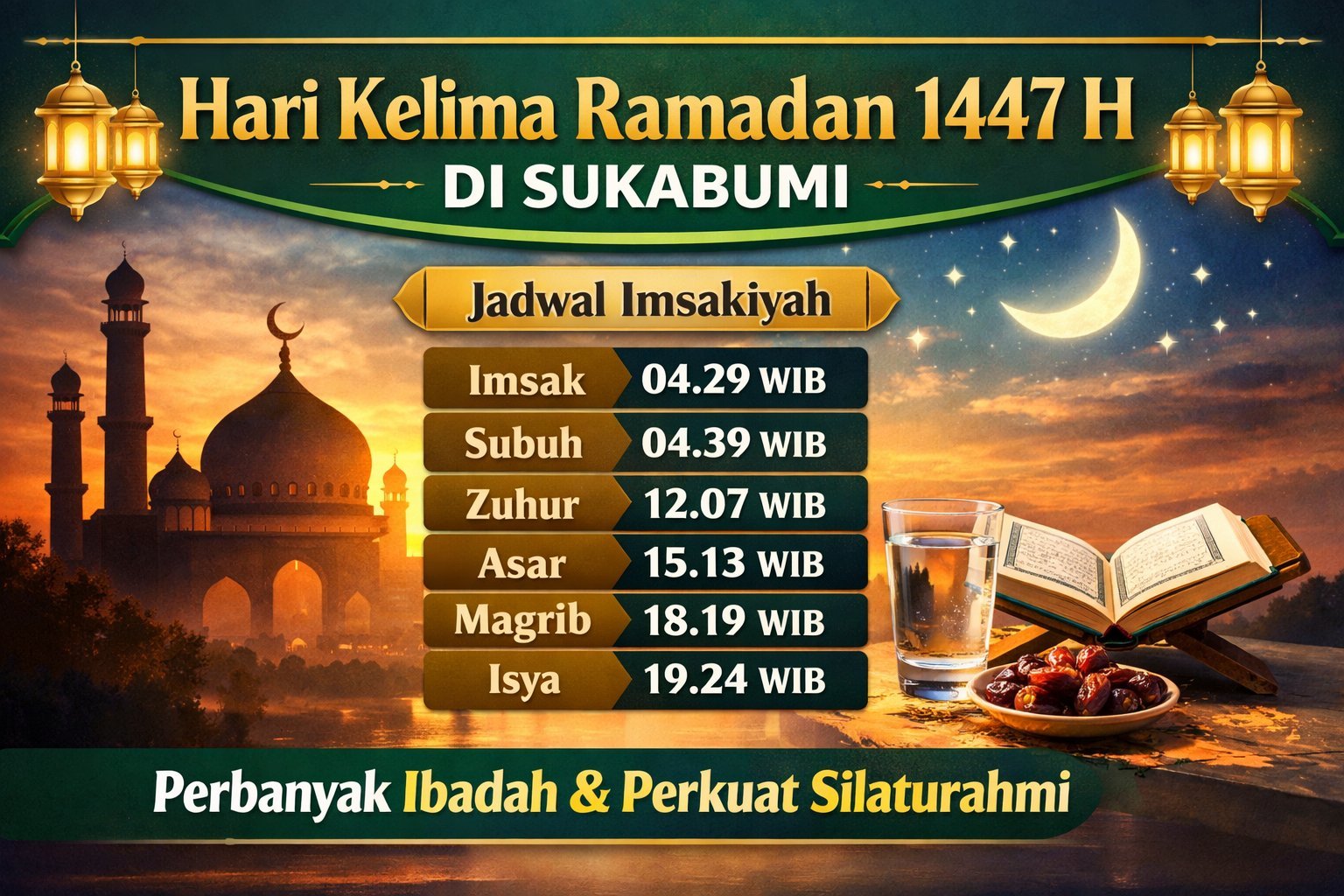 INILAHSUKABUMI.COM – Umat Muslim di Kota dan Kabupaten Sukabumi memasuki hari kelima ibadah puasa Ramadan 1447 Hijriah pada Senin, 23 Februari 2026. Sebelumnya, pemerintah melalui Kementerian Agama Republik Indonesia telah menetapkan 1 Ramadan 1447 H jatuh pada Kamis, 19 Februari 2026, sehingga hari ini bertepatan dengan 5 Ramadan 1447 H.