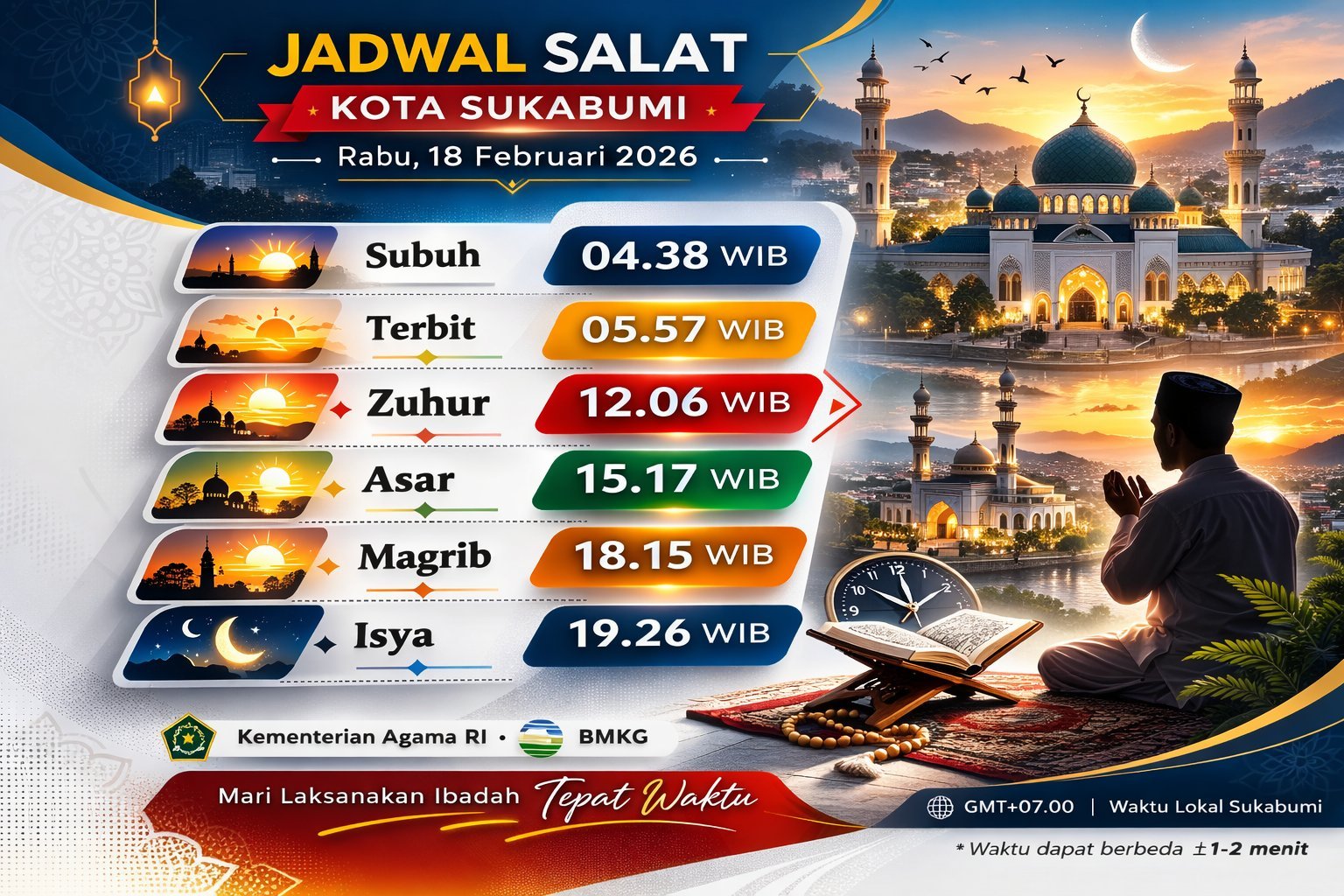 INILAHSUKABUMI.COM – Jadwal salat untuk wilayah Kota Sukabumi, Jawa Barat, dan sekitarnya pada Rabu (18/2/2026), telah dirilis berdasarkan data resmi Kementerian Agama Republik Indonesia. Umat Muslim diimbau untuk memperhatikan waktu salat sebagai pedoman dalam menjalankan ibadah wajib lima waktu secara tepat waktu.
