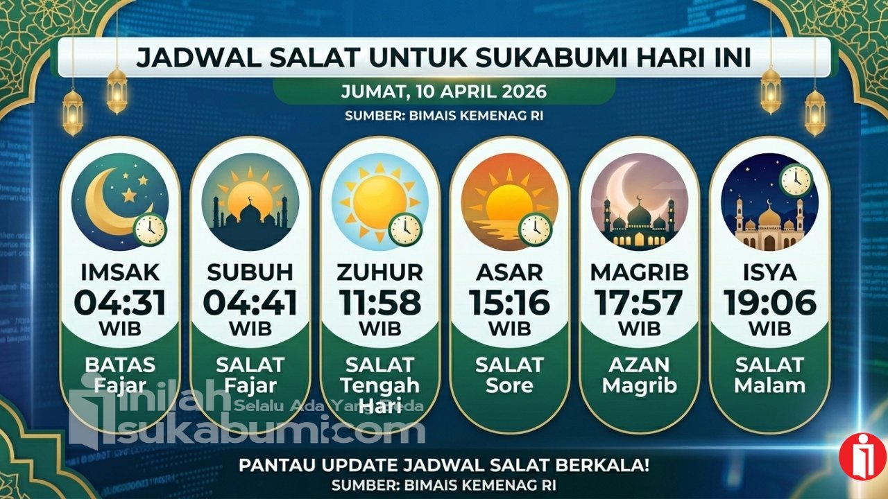 INILAHSUKABUMI.COM – Direktorat Jenderal Bimbingan Masyarakat Islam Kementerian Agama Republik Indonesia (Bimas Islam Kemenag RI) telah menetapkan waktu salat bagi umat muslim di wilayah Sukabumi. Bagi masyarakat yang berdomisili di kawasan Kota maupun Kabupaten Sukabumi, daftar jadwal salat lima waktu ini dapat dijadikan pedoman untuk menjalankan kewajiab ibadah secara tepat waktu pada hari Jumat (10/4/2026).