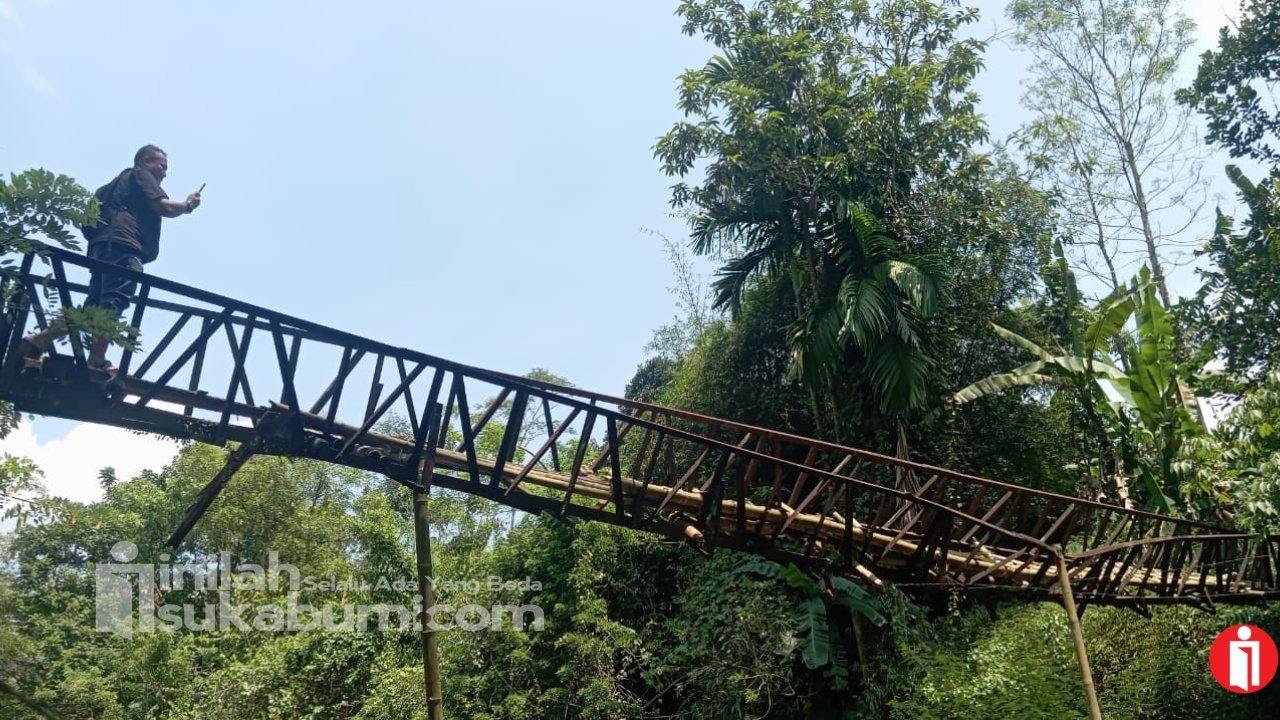 Jembatan Kamandoran di Kampung Kamandoran RT 03/RW 09, Desa Karangtengah, Kecamatan Cibadak, Kabupaten Sukabumi, terancam roboh dan membahayakan warga sekitar. Foto: INILAHSUKABUMI.COM