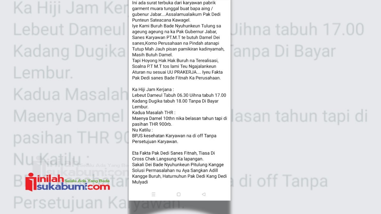 The post Karyawan PT Muara Tunggal Kirim Surat Terbuka untuk KDM, Ungkap Tiga Persoalan Penting first appeared on Inilah Sukabumi.