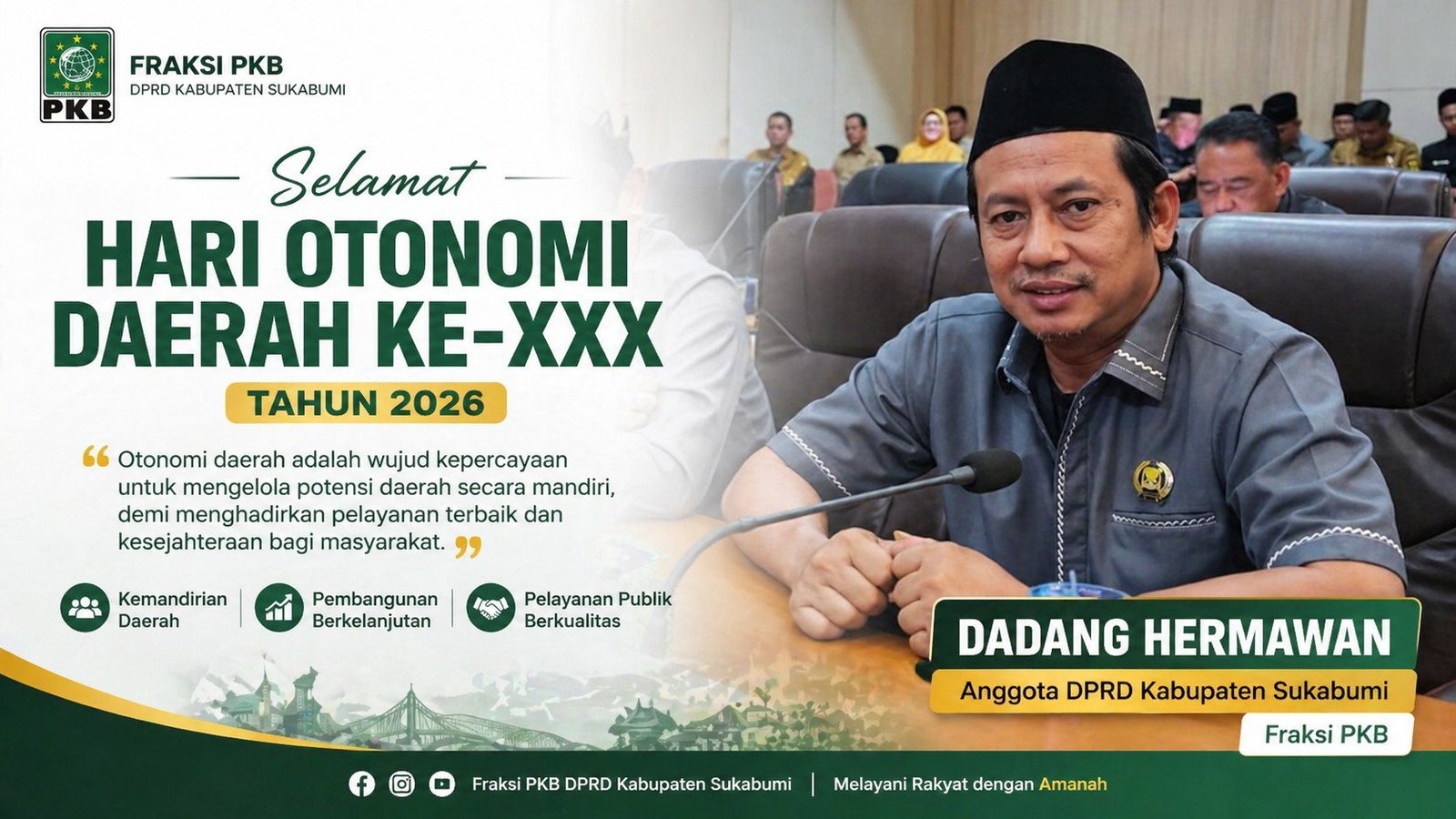 SUKABUMI – Dalam rangka memperingati Hari Otonomi Daerah ke-XXX tahun 2026, Anggota DPRD Kabupaten Sukabumi dari Fraksi PKB, Dadang Hermawan, menyampaikan ucapan sekaligus harapan agar semangat otonomi daerah terus diperkuat demi kemajuan daerah dan kesejahteraan masyarakat.