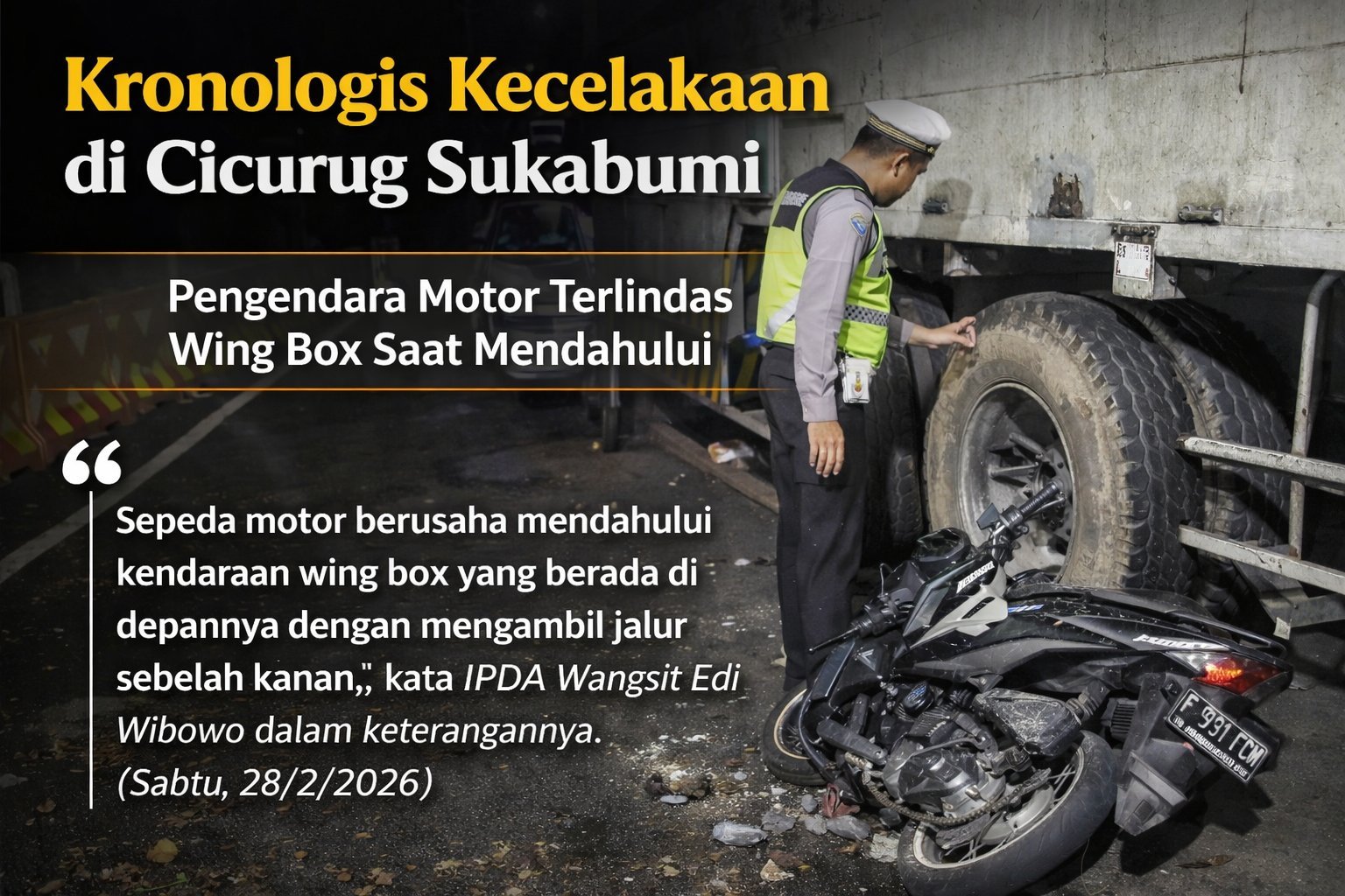“Setibanya di tempat kejadian perkara, sewaktu melintasi jalan lurus, sepeda motor berusaha mendahului kendaraan wing box yang berada di depannya dengan mengambil jalur sebelah kanan,” ujar Wangsit Edi Wibowo dalam keterangannya, Sabtu (28/2/2026).