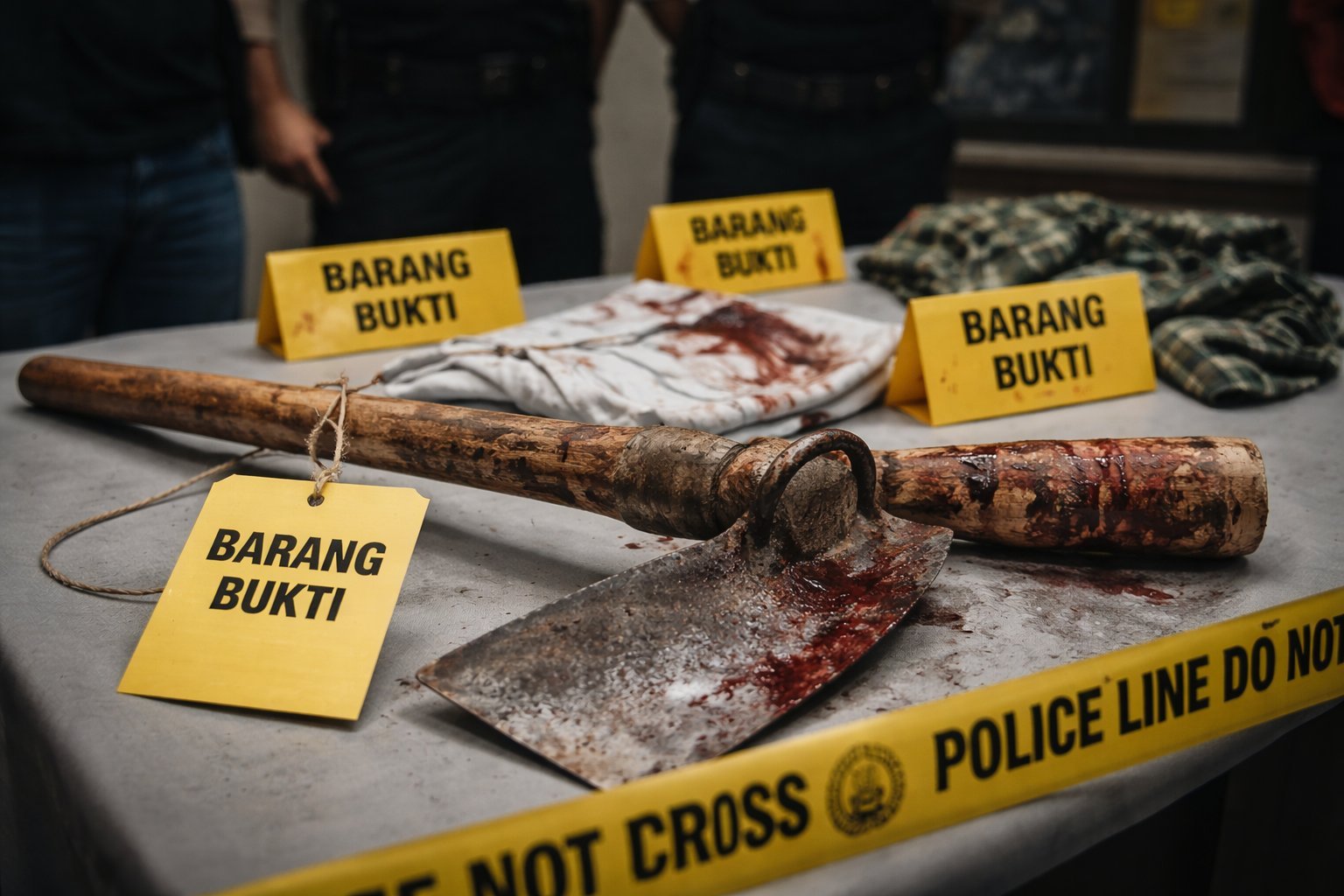 Kasat Reskrim Polres Sukabumi, AKP Hartono, mengatakan barang bukti yang diamankan meliputi satu buah cangkul, pakaian milik korban, serta sebatang kayu singkong yang diduga digunakan dalam aksi kekerasan. Seluruh barang bukti tersebut telah diamankan setelah petugas melakukan olah tempat kejadian perkara (TKP).