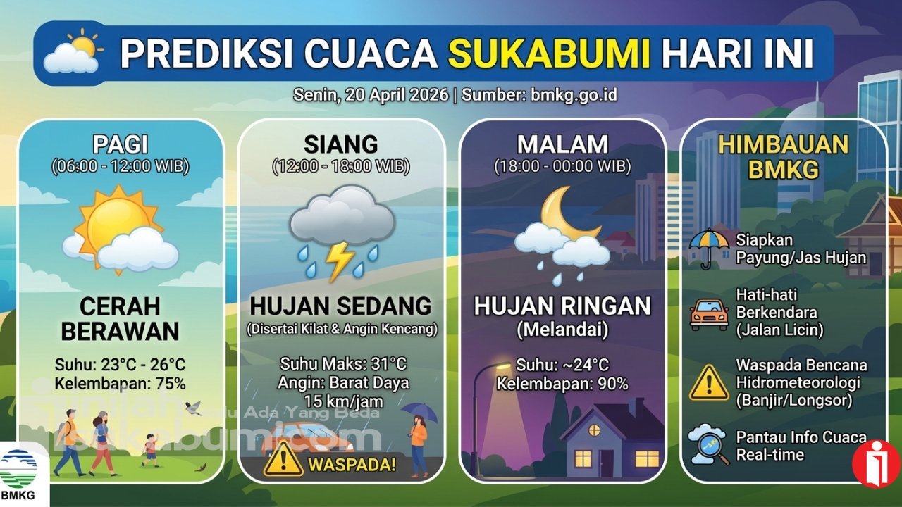 INILAHSUKABUMI.COM – Badan Meteorologi, Klimatologi, dan Geofisika (BMKG) merilis prakiraan cuaca untuk wilayah Kota dan Kabupaten Sukabumi pada Senin, 20 April 2026. Berdasarkan data terbaru, cuaca diprediksi mengalami perubahan dari cerah berawan pada pagi hari menjadi hujan ringan hingga sedang pada siang dan sore hari.