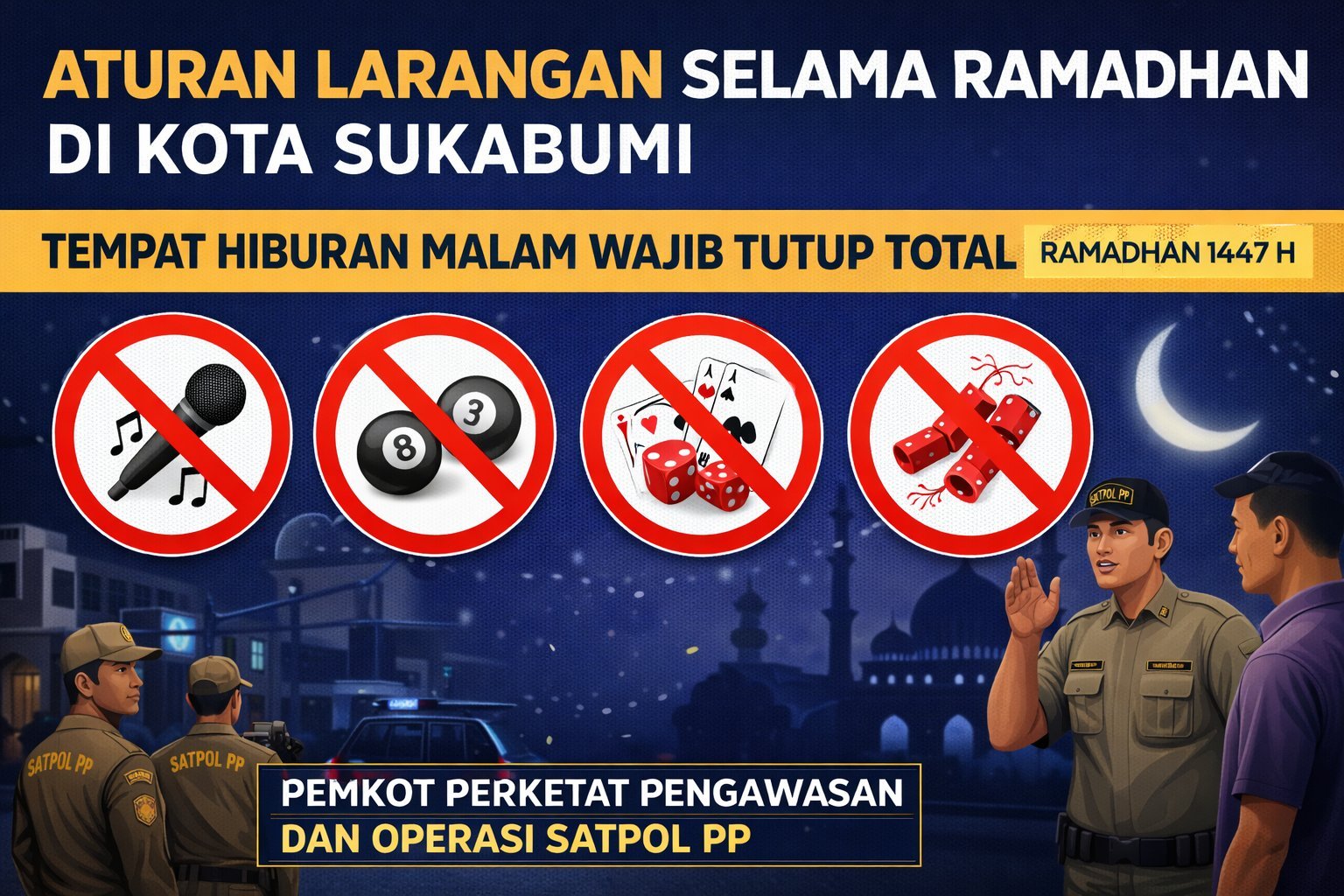 Kepala Bidang Ketertiban Umum dan Ketenteraman Masyarakat (Trantibum) Satpol PP dan Damkar Kota Sukabumi, Firman Taufik, menegaskan bahwa seluruh tempat hiburan malam wajib menghentikan operasional selama Ramadan. Larangan ini mencakup karaoke, klub malam, diskotik, biliar, hingga usaha ketangkasan.