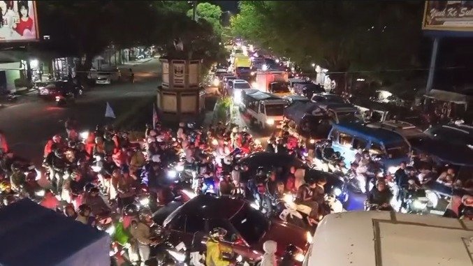 Pantauan dari udara menggunakan drone memperlihatkan antrean panjang kendaraan roda dua dan roda empat yang saling berhimpitan di persimpangan. Bahkan, di sejumlah titik, kendaraan terlihat tidak bergerak sama sekali.