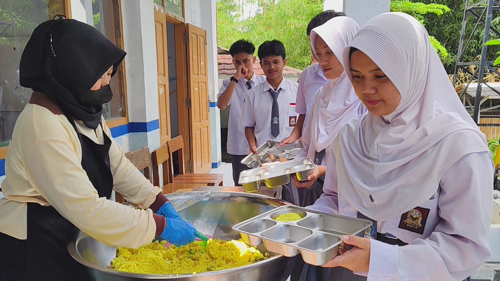 Tidak lagi identik dengan menu yang itu-itu saja, para siswa kini disambut beragam hidangan hangat yang tertata rapi di meja panjang. Antrean pun terasa lebih hidup, diiringi interaksi santai antara siswa dan guru yang menikmati momen kebersamaan.