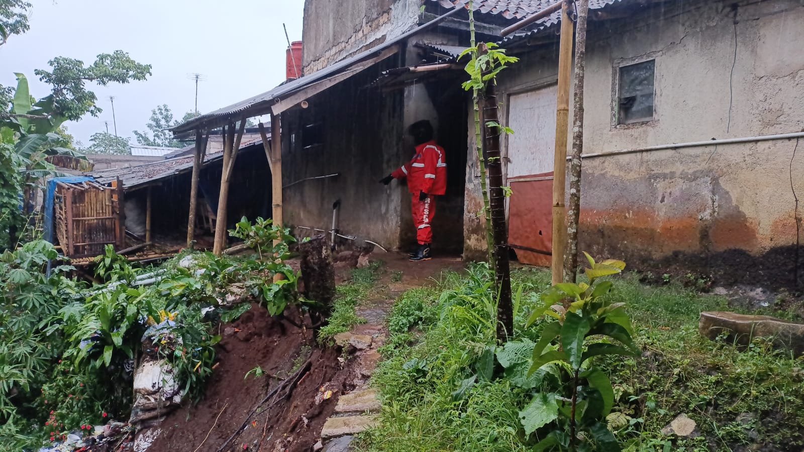 Sementara di lokasi lainnya, longsor juga terjadi di belakang rumah Ujang Supriatna (40), menyebabkan dinding rumah retak-retak serta mengalami pergeseran.