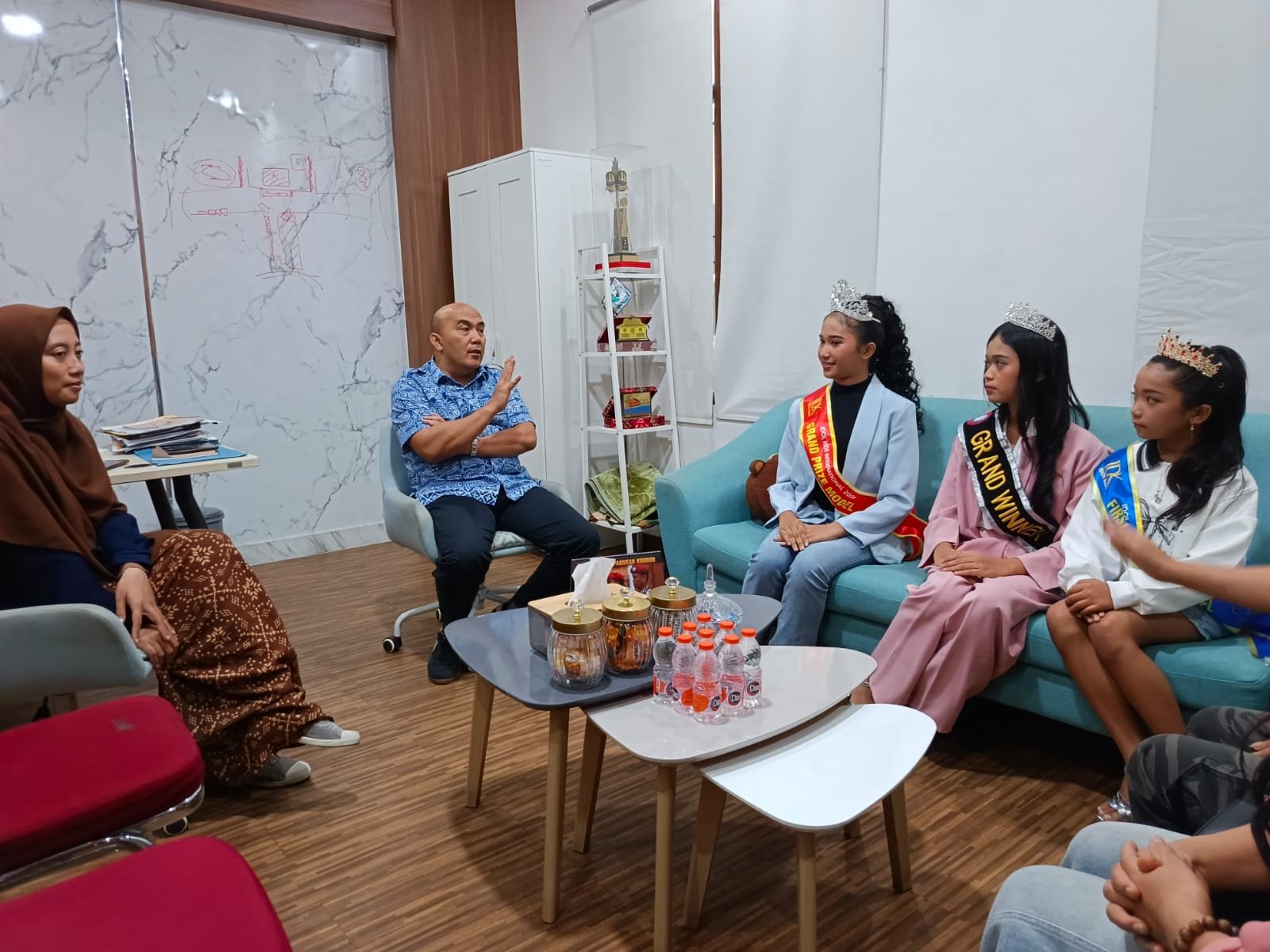 KUNJUNGAN: Kepala Disbudporapar Kota Sukabumi, Rahmat Sukandar saat menerima kunjungan tiga model asal Kota Sukabumi yang go internasiolan, Kamis (9/4). FOTO: ISTIMEWA