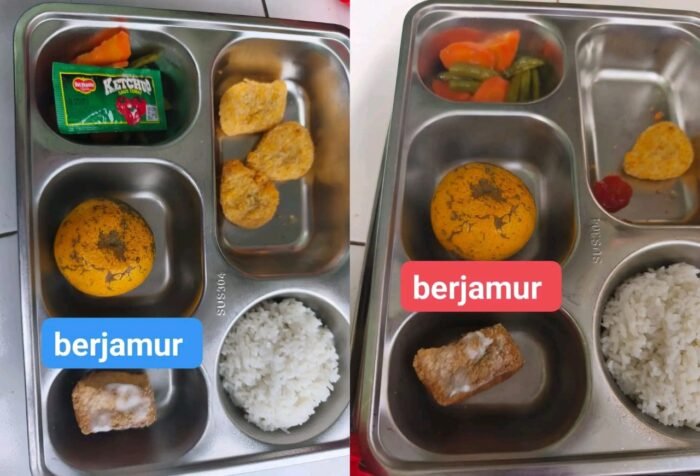 Dalam video tersebut terlihat satu paket makanan MBG untuk pelajar yang berisi nasi, sayur kacang campur wortel, nugget, jeruk, dan tahu. Namun perhatian warga tertuju pada kondisi lauk dan buah yang dinilai sudah tidak segar. Tahu tampak berjamur, sementara jeruk terlihat lembek dan diduga sudah tidak layak dimakan.