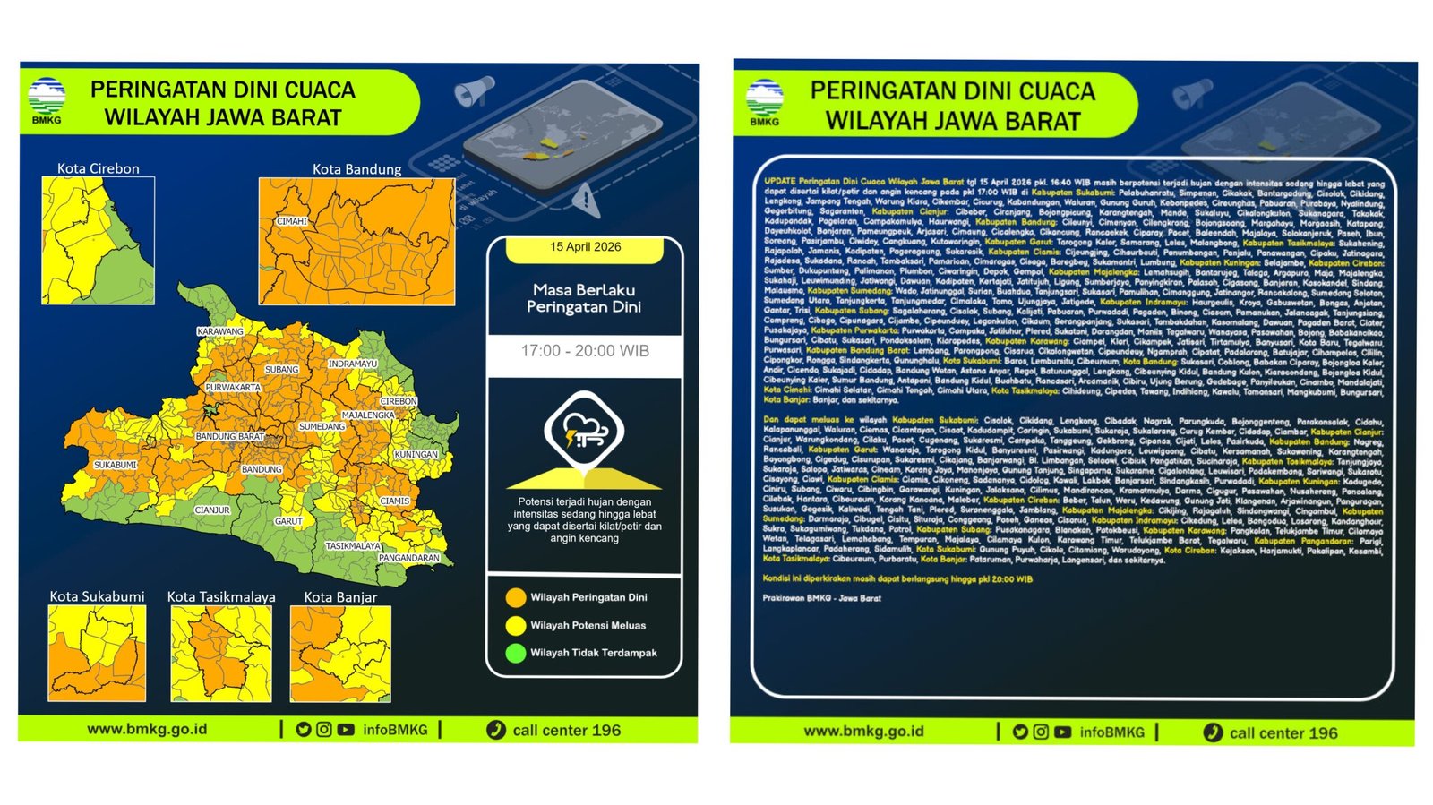 Berdasarkan rilis resmi BMKG melalui akun @infoBMKG, kondisi cuaca ekstrem pada Rabu (15/4/2026) ini diprediksi berlangsung mulai pukul 17:00 hingga 20:00 WIB.